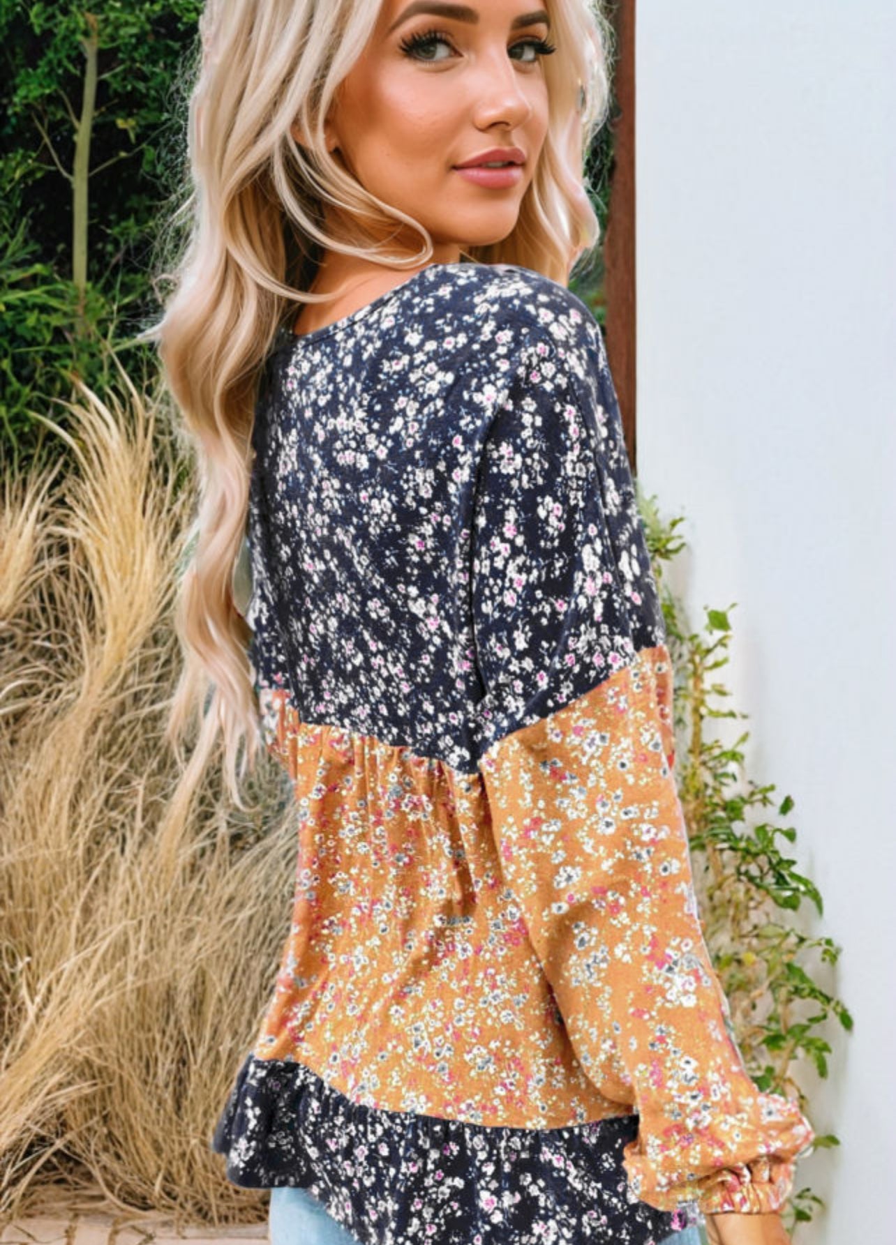 "Breeze into style with the Bess Blue Floral Color Block Top. Its unique boho vibe and ruffled hem add a playful touch to any outfit. With long puffed sleeves and a round neck, this top is both trendy and comfortable. Complete your wardrobe with a pop of blue floral!"
