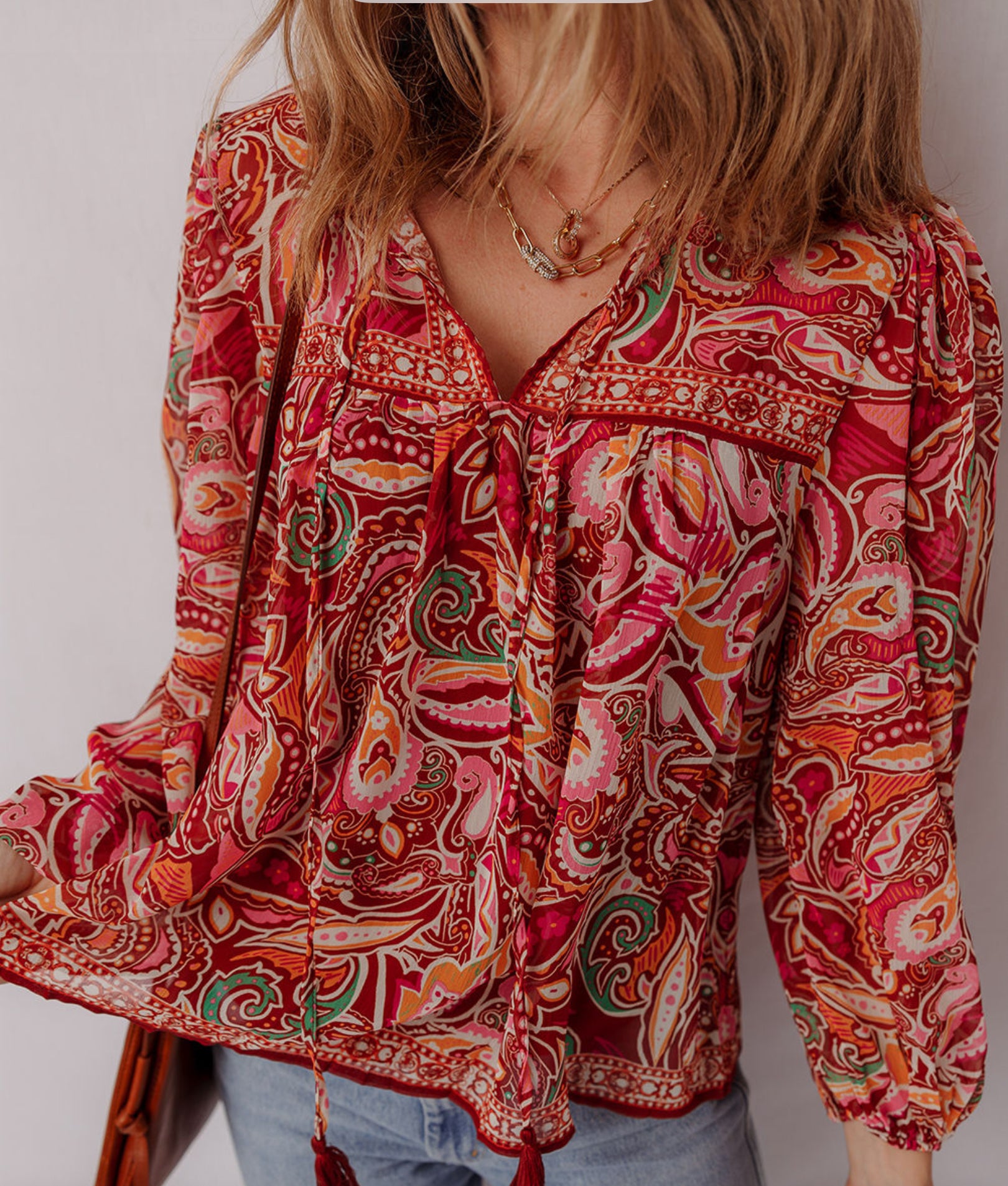 Show off your boho side with our Carol Paisley Print Tassel Tie Top. With its vibrant paisley print and playful puff sleeves, you'll exude bohemian charm. Enjoy ultimate comfort in this relaxed, flowy fit top - perfect for any occasion!