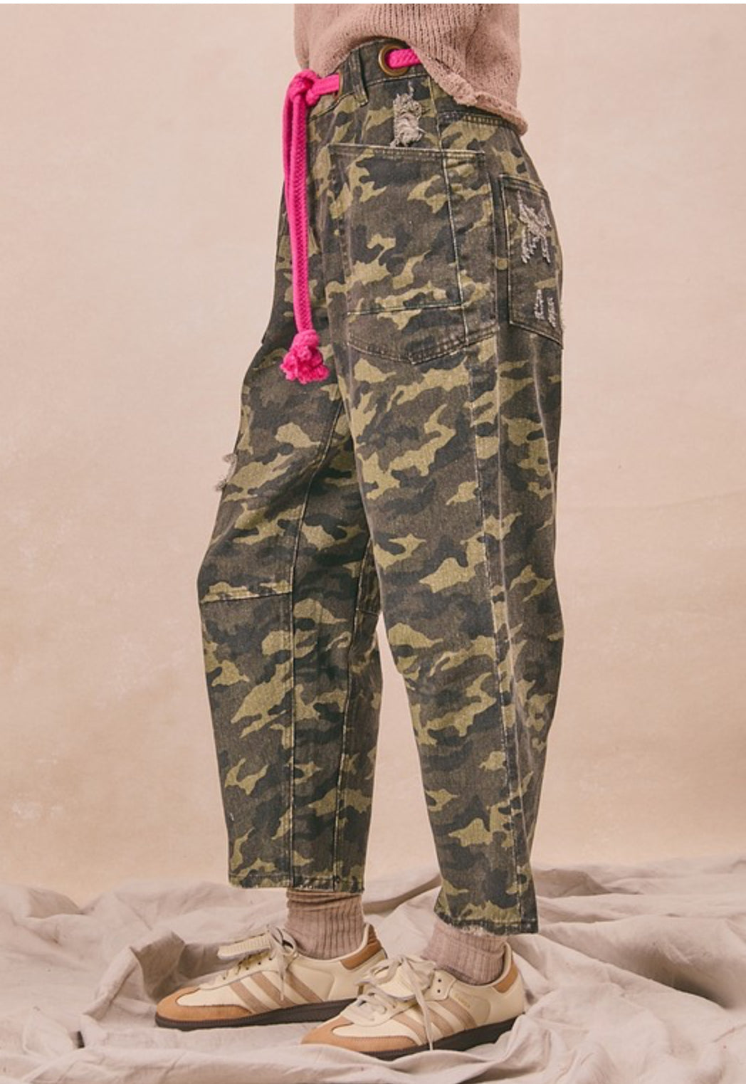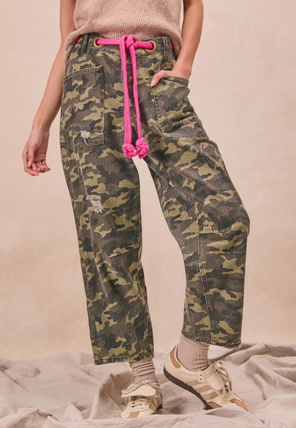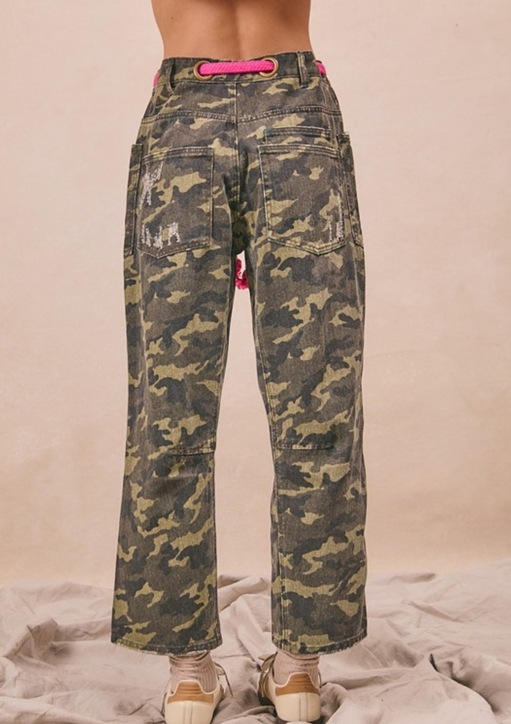 "Rock your style with Cleo Camo Jeans! These hot pink rope belt jeans feature a playful camo print, front patch posters, and a loose fit for ultimate comfort. Step out in confidence and be fabulous in these quirky and fun jeans. (Warning: may cause excessive compliments.)"
