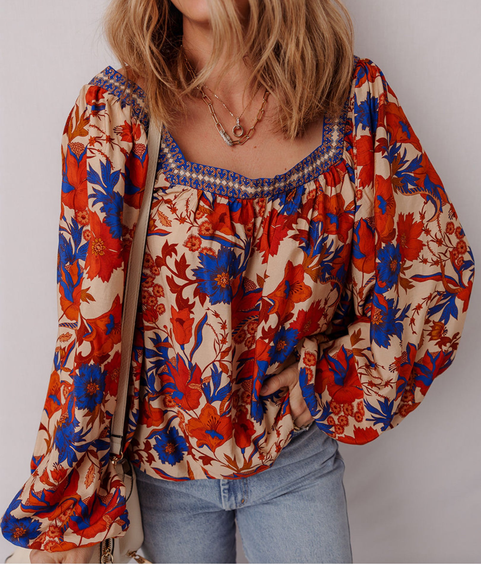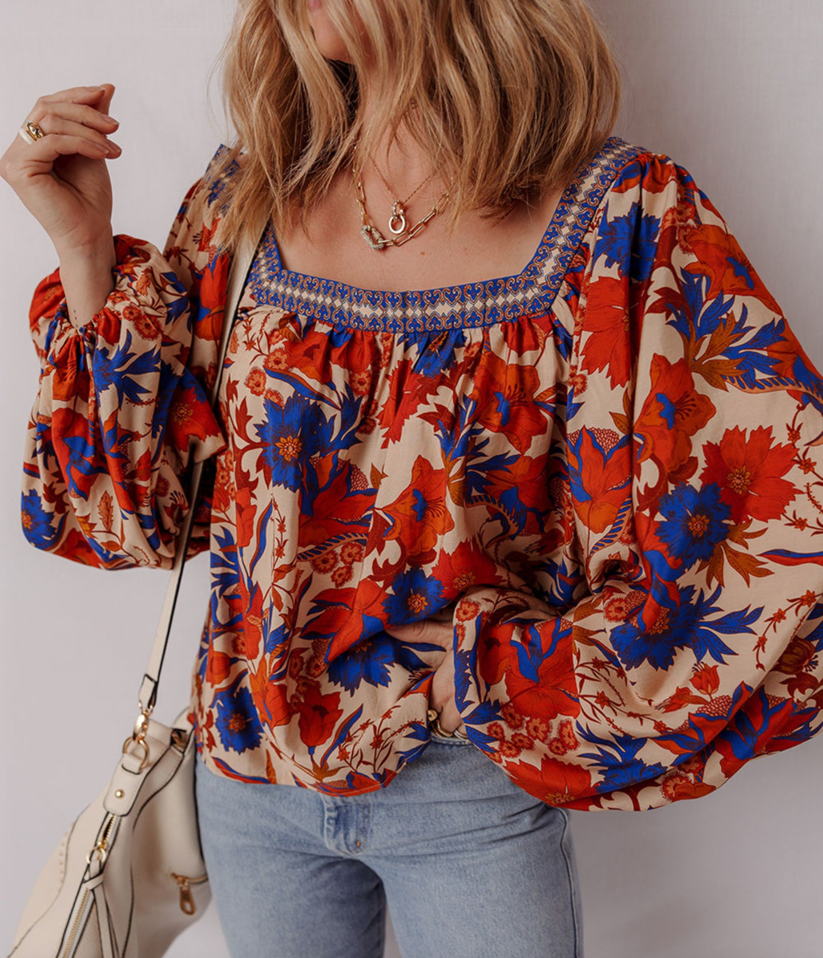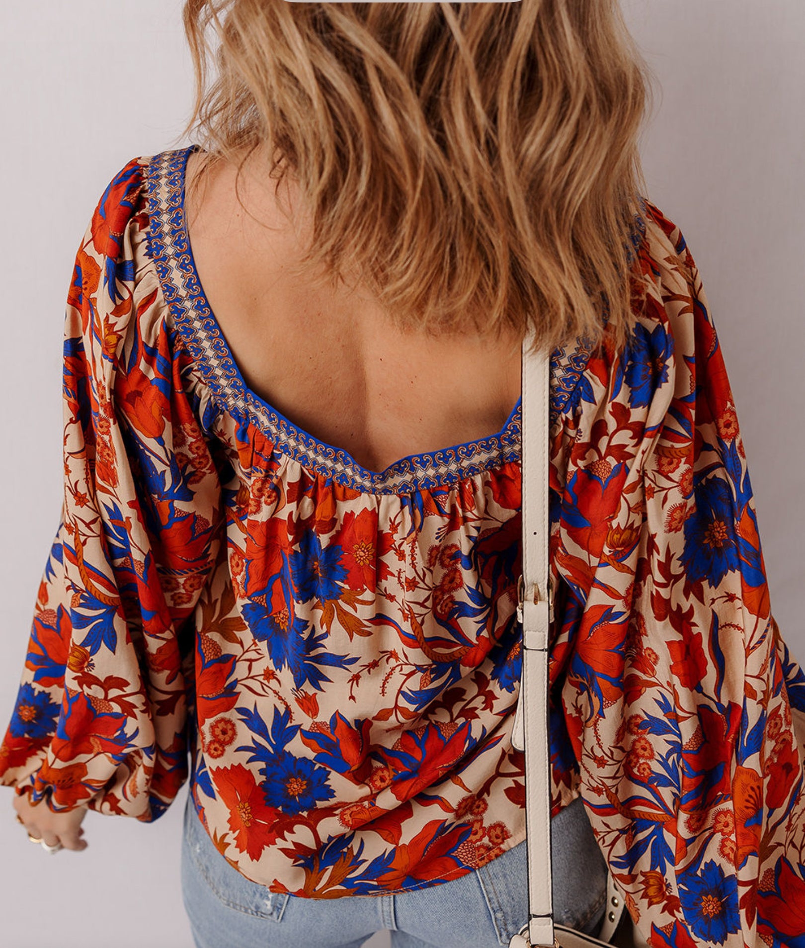 Indulge in luxury with our Kara Floral Print Square Neck Backless Top. The bold floral pattern, soft lightweight fabric, and flowy fit will elevate any outfit. Featuring long puff sleeves, this top can be paired with jeans or tailored pants to create a chic and sophisticated look.